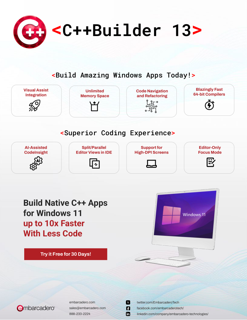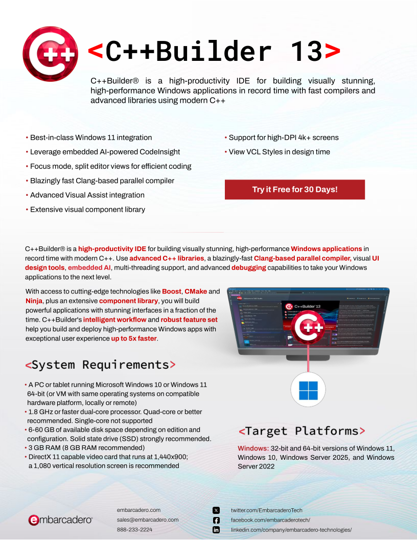 C++Builder Modern Win64编译器已更新到Clang 20。新的基于Clang 20的编译器引入了对C++23的支持(默认为C++23)。这是Embarcadero对RAD Studio 12.x中提供的C++Modern工具链的重大升级,清楚地表明了Embarcadero对C++Builder的承诺。