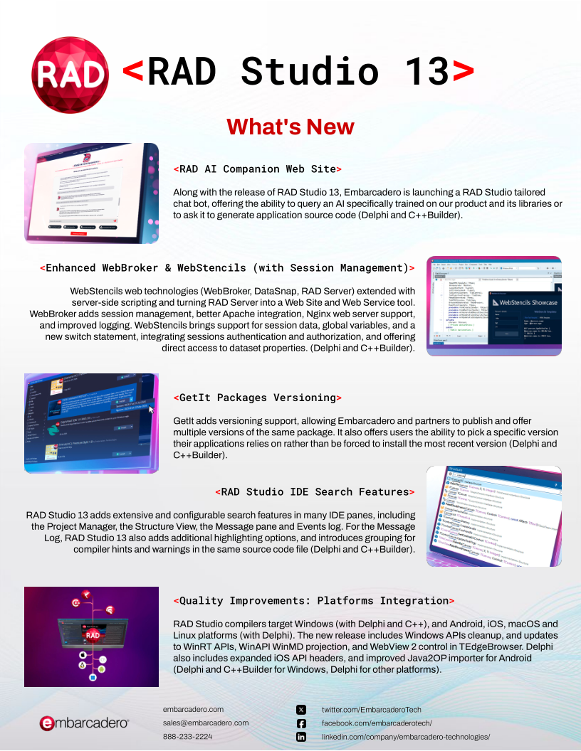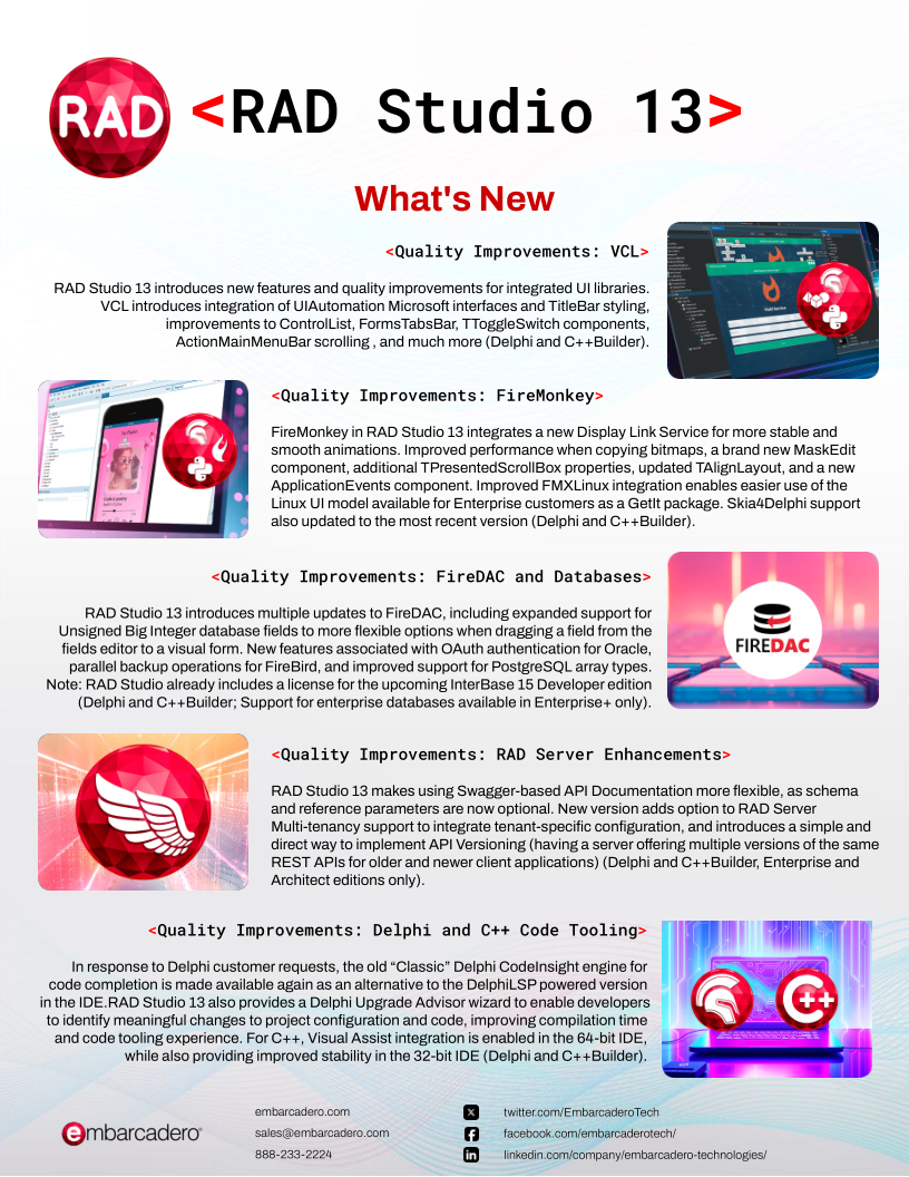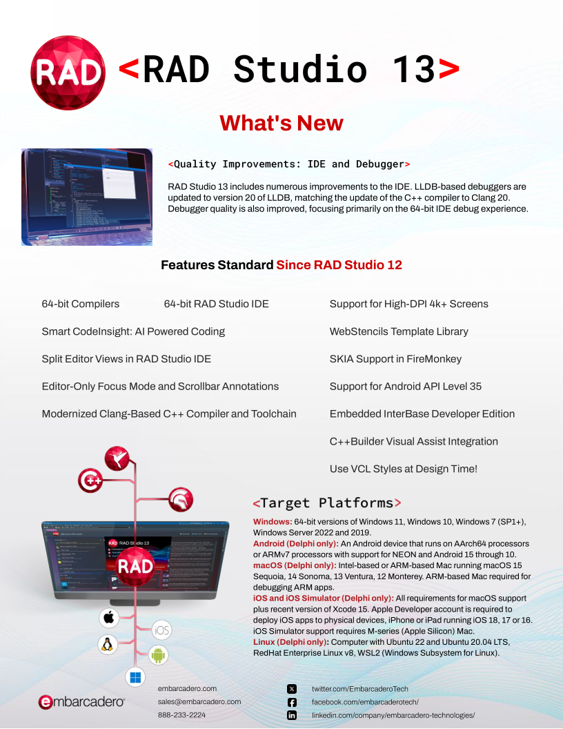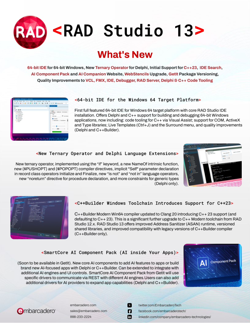 Embarcadero宣布RAD Studio 13正式发布,其中包括Delphi 13和C++Builder 13。