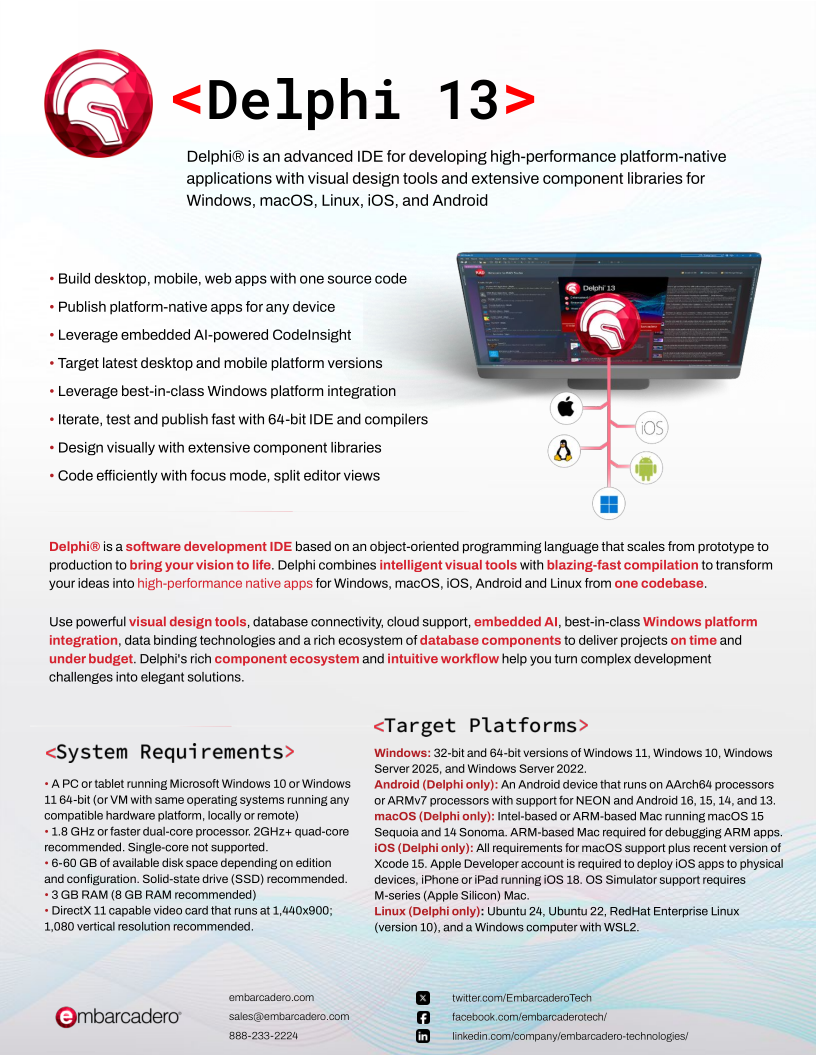 Embarcadero 旗下Delphi 信誉卓著超过 23 年,是全球 Object Pascal 开发人员创建跨设备酷炫 APP 的首选。Delphi 是编写、编译、打包和部署跨平台本地原生应用的最快方式。