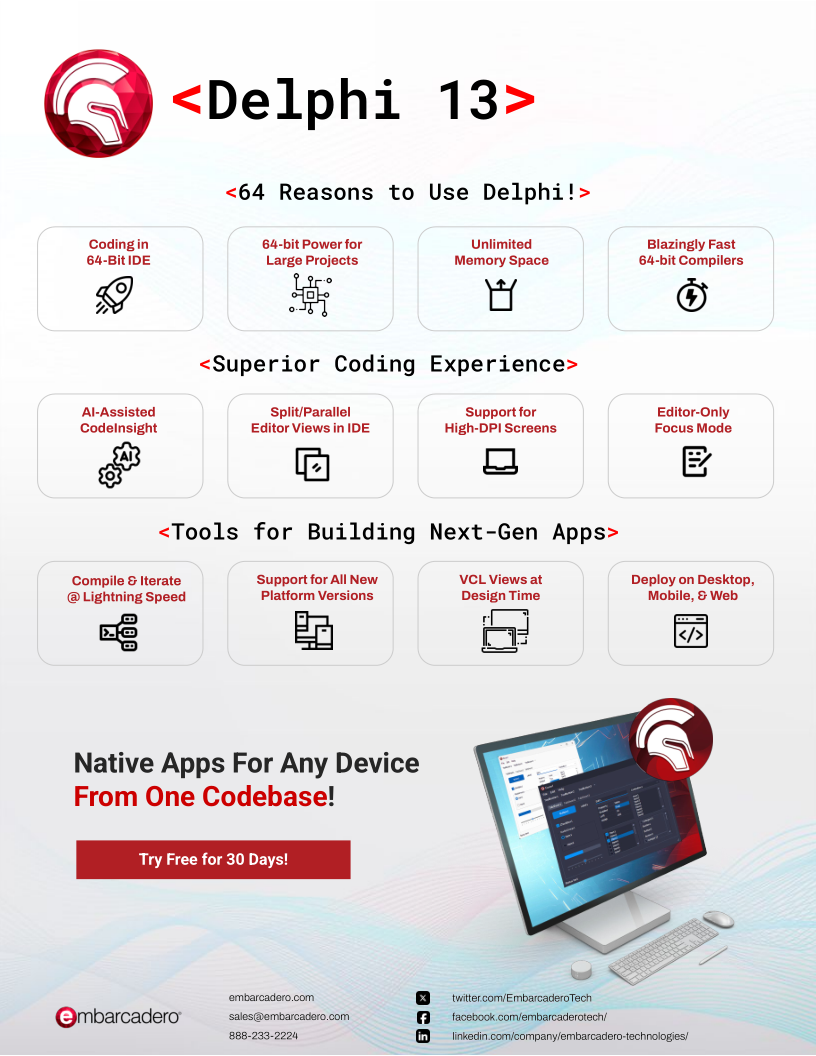 RAD Studio 13 Florence现已发布!Embarcadero宣布RAD Studio 13正式发布,其中包括Delphi 13和C++Builder 13。